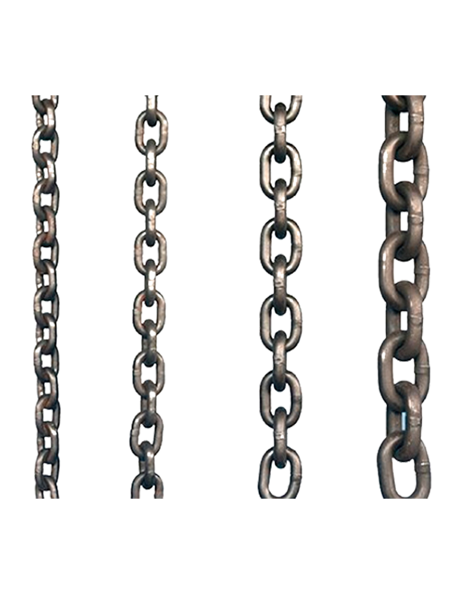 Fabricadas en acero al carbono trefilado, maleables, perfectamente soldadas sin aporte de material, eléctricamente a tope.Las cadenas se fabrican de eslabón derecho corto (ver tabla más abajo), derecho extra corto y derecho largo y eslabón retorcido.