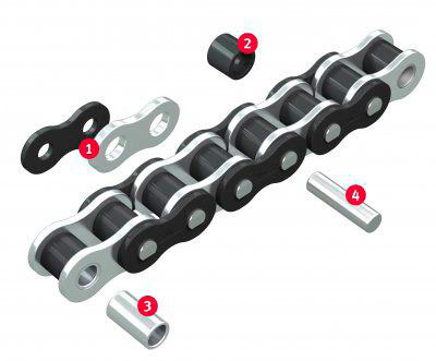 También se puede utilizar la cadena sin rodillos (con el buje clavado E), en caso de no deslizarse sobre guías.